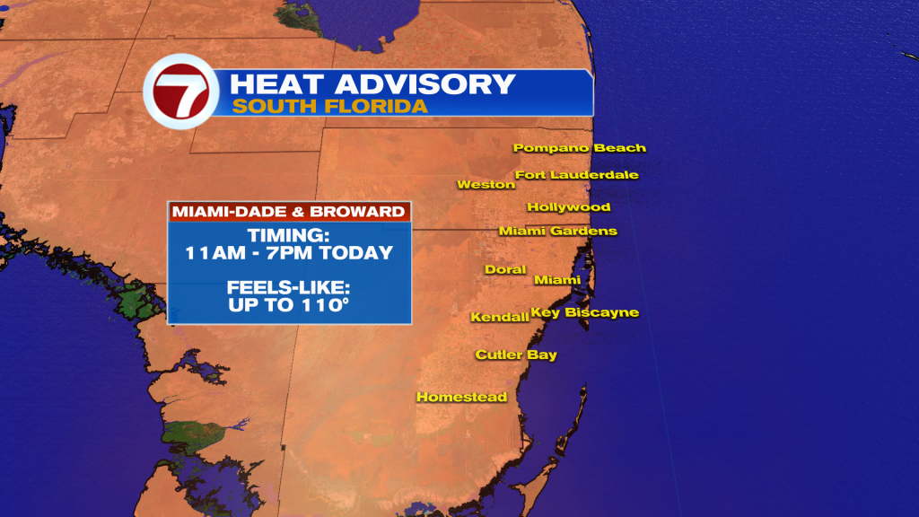 Heat Advisories are posted for all of South Florida Friday for feels-like temperatures up to 110-112F from the late-morning through the evening hours.
