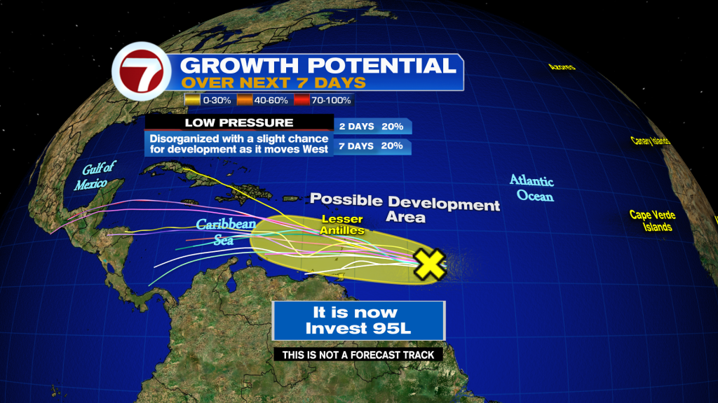The heat is set to continue, but there seems to be some help on the way. Models are showing Saharan dust is set to depart midweek as high-pressure backs away into the Western Atlantic Ocean allowing an ocean breeze to return. This will help bring temperatures closer to average, but draw in more moisture. Therefore, a typical Summer pattern will be pressure with passing morning showers and afternoon sea breeze inland storms returning to the forecast.