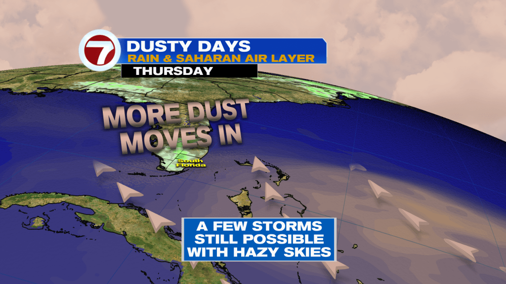 By midweek, we’ll be between dust plumes given that another batch of dust is forecast to move over South Florida by Friday. In between bataches, we could see a few additional showers and storms break out but overall rain chances will be lower than normal with more sunshine in place along with a continuation of the heat wave.