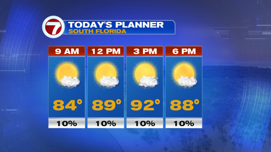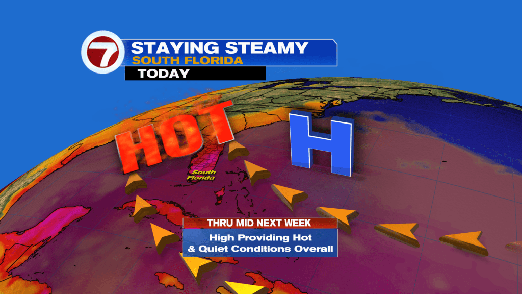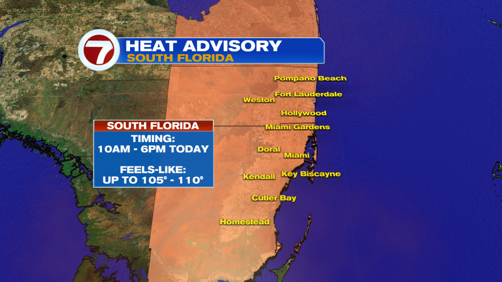 A Heat Advisory is in effect for Miami-Dade and Broward today for peak feels-like temperatures up to 105-110F.