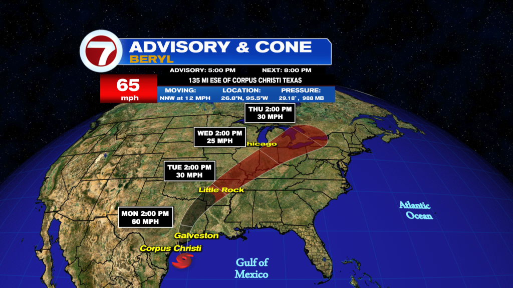 A quick check on the tropics, we continue to track Tropical Storm Beryl as it moves closer to the Texas coastline. The 5 PM advisory showed winds of 65 mph, maintaining its tropical storm status. Beryl is forecast to make landfall along the Texas coast between Corpus Christi and Galveston by early Monday before dawn. And while Beryl remains a tropical storm this afternoon, some strengthening is still possible before landfall as water temperatures over the Gulf of Mexico where Beryl will be moving into this evening are very warm (about 87°). In addition, Beryl will be moving into an area of the Gulf of Mexico with very little wind shear. A hurricane warning remains in place for the Texas coast from Baffin Bay northward to San Luis Pass and a hurricane watch north of San Luis Pass to Galveston Island.