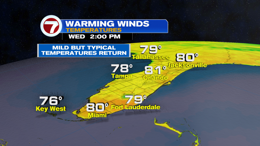 Today will be another gorgeous day across South Florida. An area of high-pressure will be directly overhead, which means apart from the sunshine, the low humidity and the pleasant temperatures, our wind pattern will be lighter than it has been in a few days. But as winds veer a bit off the water later this afternoon, our afternoon and high temperatures may be about a degree or too warmer than yesterday. Temperature should be nearing 80° today, which is actually what is normal this time of year for South Florida. Rain will once again remain out of the forecast as we get to enjoy plenty of outdoor time on these final days of ‘winter’.