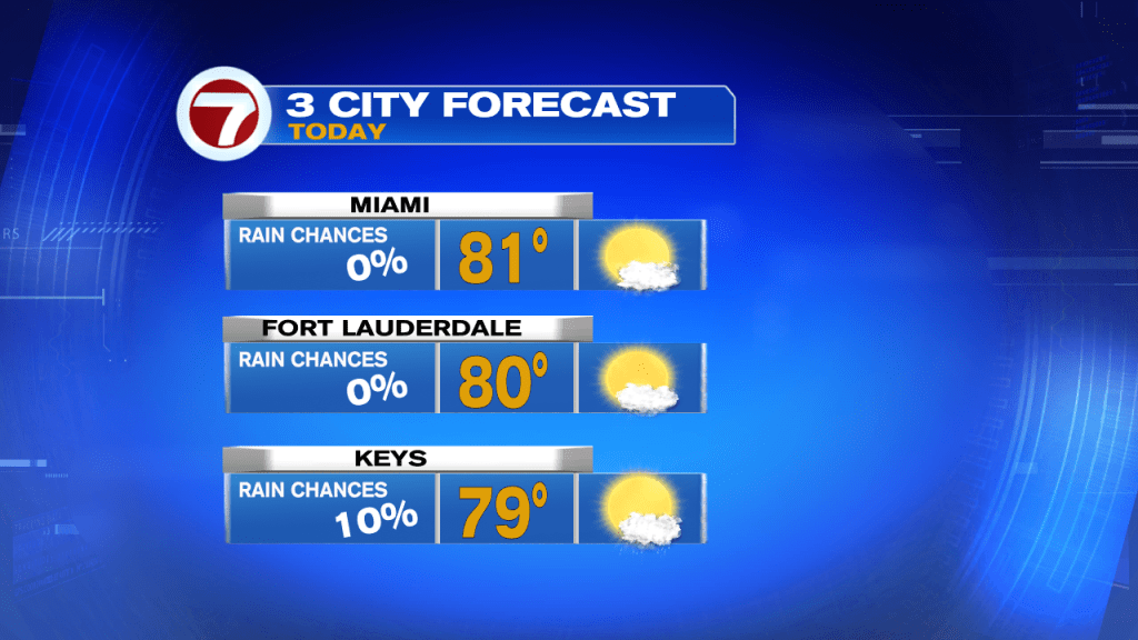 The warm-up we have been talking about will be gradual so many may not even feel much of a difference until next week. But if you were up and about early this morning, then you may have begun to notice the difference, especially across some of our coastal locations. While our temperatures this morning were not AS cool, many spots in South Florida woke up comfortably in the mid 60s. Once again afternoon high temperatures today will be near 80° for most of us. Other than a spotty shower across the FL Keys, much of South Florida will remain mainly dry with beautiful blue skies once again today.