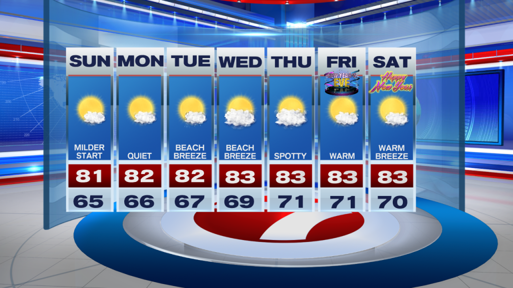 The gradual warming trend will continue into the work week. A wind out of the East will help our overnight temperatures rebound once again back into the upper 60s and low 70s throughout the week. And while humidity levels are not expected to be AS high as we saw before the cooldown, you may notice it is a bit more humid during the evening and morning hours. Our breeze will begin to pick up by the middle of the workweek and with stronger winds off the water, a light shower cannot be ruled. Afternoon temperatures will also return to the mid 80s across all of South Florida by the end of the work week. Looks like the last week of the year may actually end the same way the new year will begin…on a warm note. In the meantime, let’s enjoy whatever beautiful weather we have left this holiday weekend.