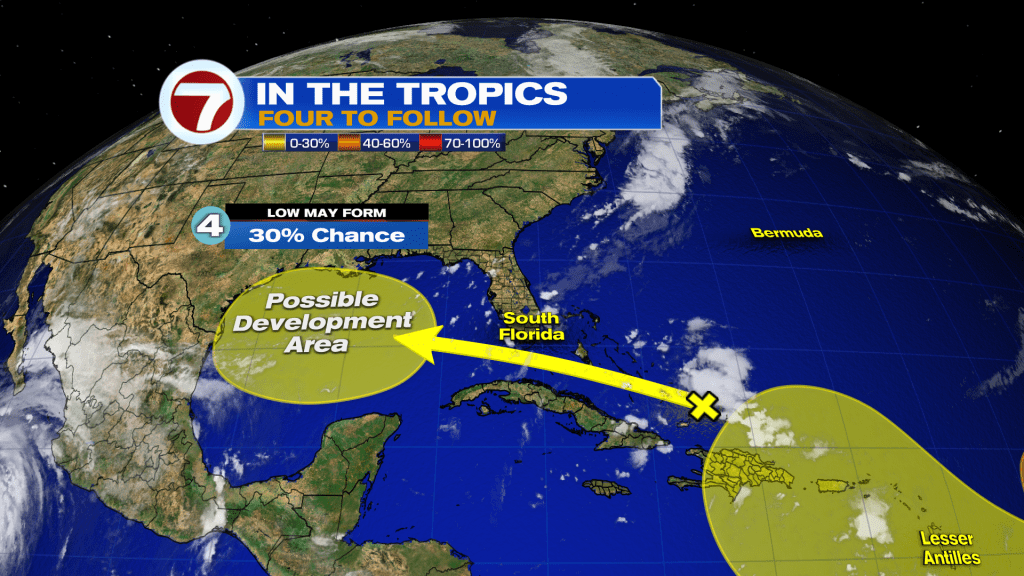 4. Tropical wave to pass through South Florida is forecast to move into the Gulf of Mexico by early next, where a broad area of low pressure could form. Some slow development of this system is possible as it approaches the Western Gulf of Mexico coastline by the middle of next week. It has a low chance to develop of 30%.