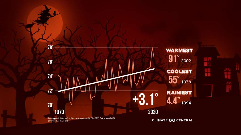 Our Halloweens have been getting warmer over the years as this graphic from Climate Central will attest. Since 1970 the average temp on Trick or Treat day has climbed over three degrees. The coolest was in 1938, the warmest in 2002, with the wettest in 1994. But that will not be the case this year.