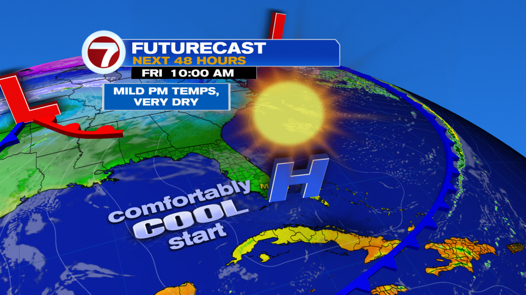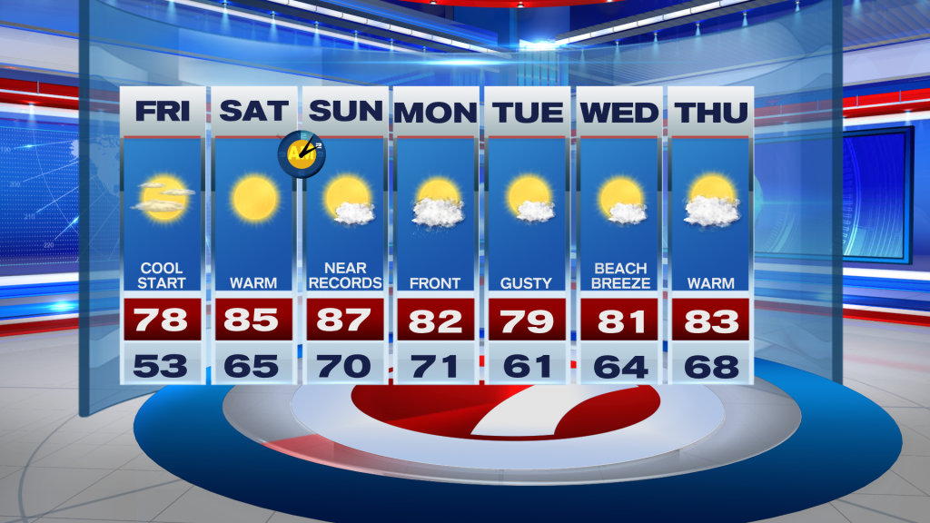 After a chilly start, South Florida can expect another afternoon with picture perfect conditions. Bright sunshine returns to the forecast while we get to enjoy low humidity once again. Our wind pattern will be veering off the water later today, which will cut the cold air supply for South Florida. That means our afternoon high temperatures will be reaching into the mid to upper 70s (which is typical) before a warm-up begins. It will be a nice end to the work week before we begin to undergo some big changes for the upcoming weekend.