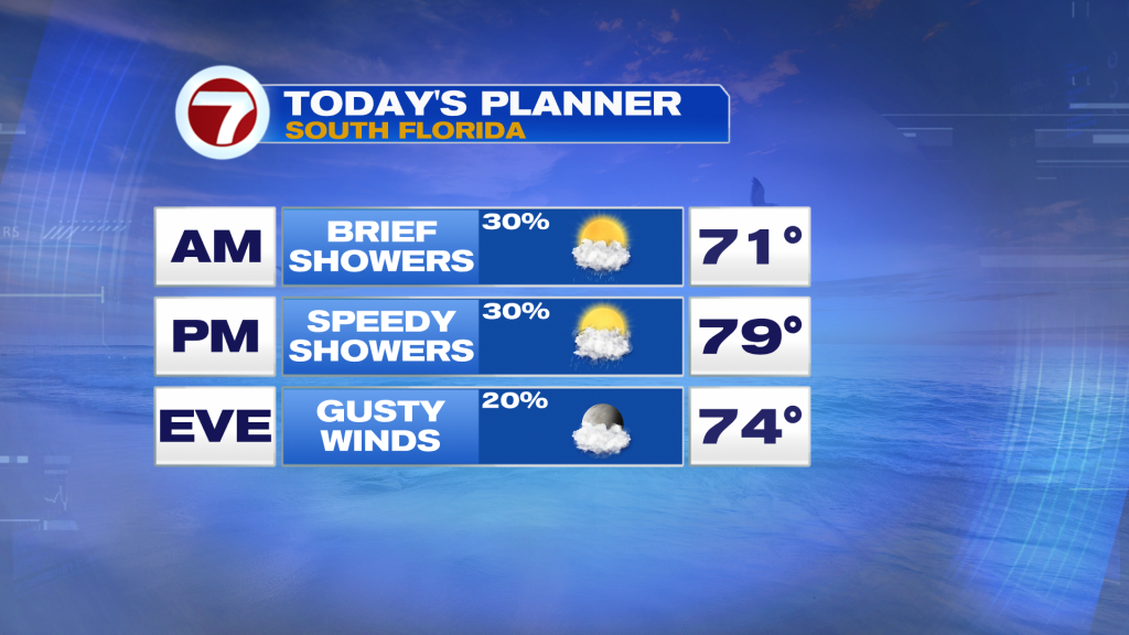 Today South Florida will notice some changes in the forecast. For one, our wind pattern is already out of the east and will be more out of the southeast later today. This not only brought milder temperatures earlier this morning but will also allow for just enough moisture to creep back into the forecast. Because of this, a few showers will be possible from time to time today. The wind off the water has also increased in speed and conditions this morning across our Florida were already quite breezy. Gusty conditions will be possible later today as wind gusts reach between 25 to 30 mph.