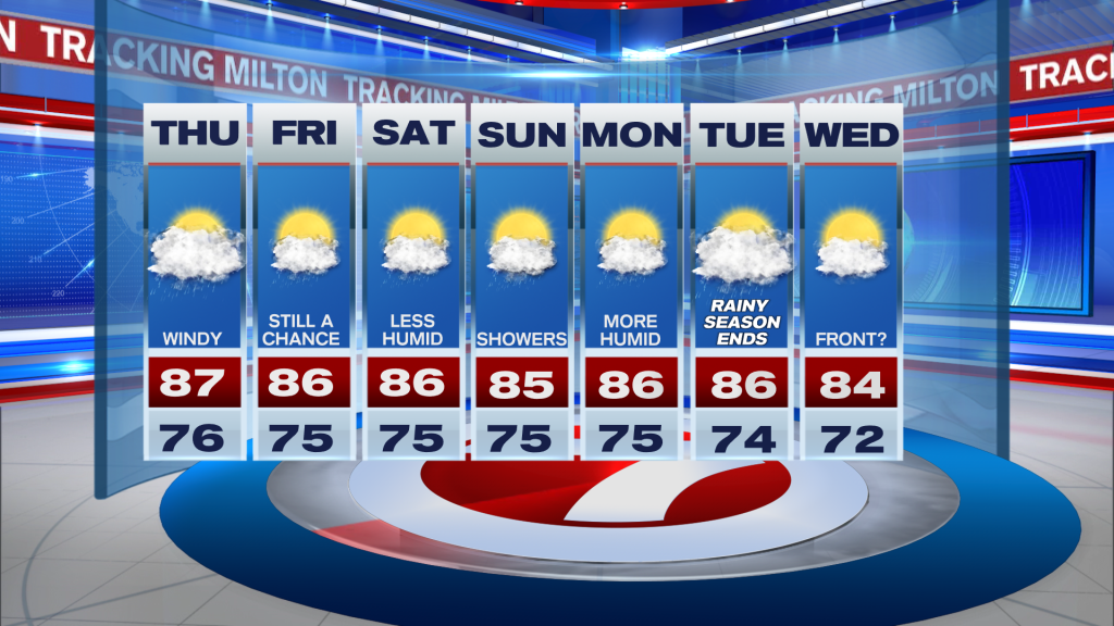 Hurricane Milton has pushed offshore and will be dragging a weak front across the state which could bring some changes for the upcoming days. First and most, as Milton moves offshore into the Atlantic, a few wrap-around showers will be possible throughout the day on Friday as winds will be out of the Northeast. Behind the front, Humidity levels may actually drop just a bit across the state, possibly signaling the beginning of the dry season (which officially begins next week). With a brisk breeze out of the northeast, temperature shouldn’t be uncomfortably warm come Friday and into the upcoming weekend. A few showers will still be possible before increasing late weekend into early next week.