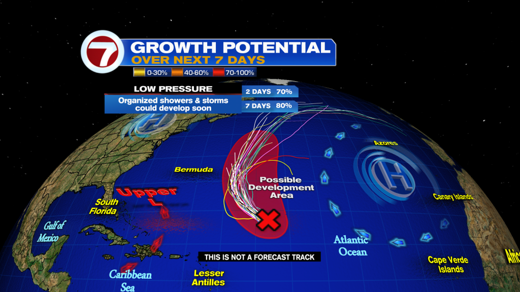 Low pressure are located about 700 miles East-Northeast of the Northern Leeward Islands could develop into a Tropical Depression in the next day or so as it moves to the Northwest over the Atlantic Ocean.