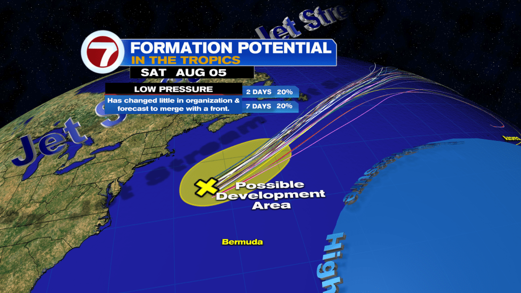 Low pressure system off the mid-Atlantic states appears to be acquiring non-tropical characteristics and has a low chance to form before merging with a front.