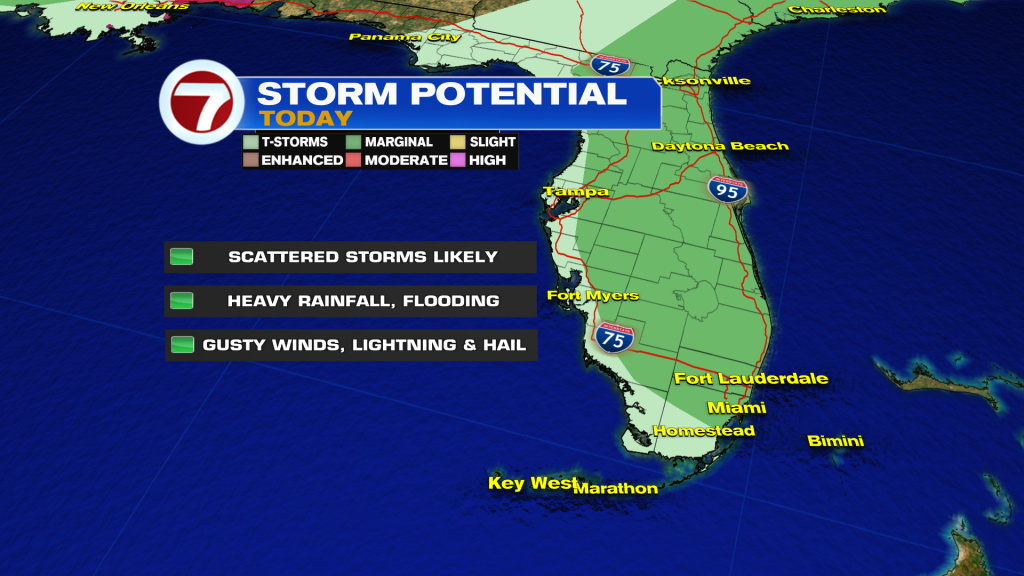 Active weather day ahead South Florida! Scattered showers & storms possible with a few becoming strong to severe. Main hazards include strong winds, frequent lightning, & heavy rainfall. Highs in the low to mid 90’s in some areas.