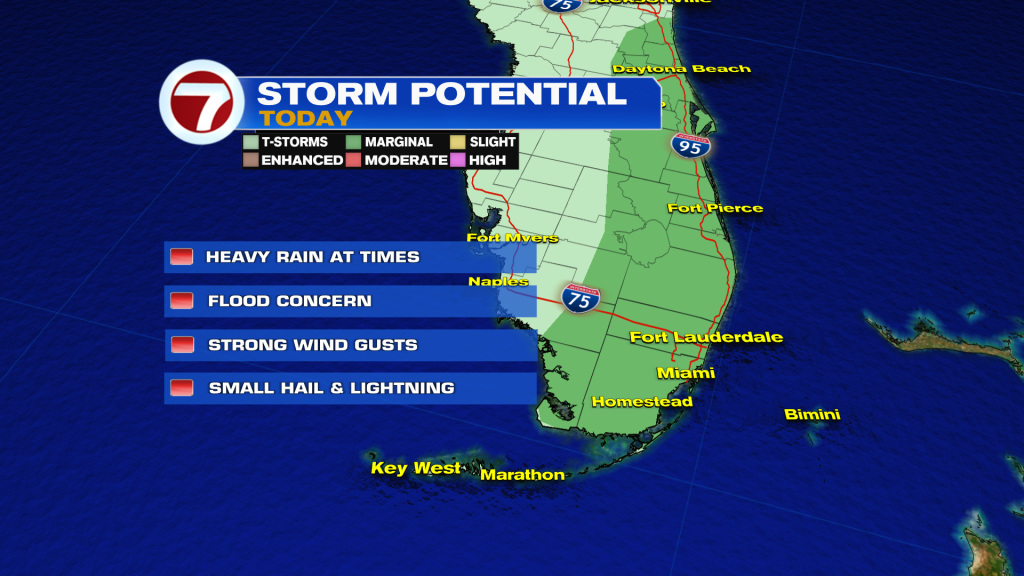 Speaking of the storms today, any storm that does develop could once again be on the stronger (to possibly even severe) side. The main threat for South Florida with any strong storm will be heavy rain, which could lead to flooding due to the ground already saturated from yesterday’s rain and thunderstorms. Frequent lightning and hail will also be a threat for any strong thunderstorm that develops today.