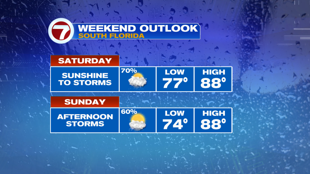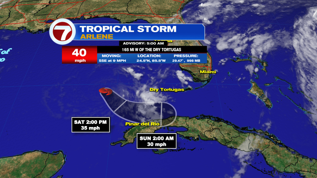 South Florida has endured a stormy stretch of weather much of this week and unfortunately that looks to continue this weekend with scattered to numerous showers and storms. All this while we track Tropical Storm Arlene that is moving to the south and toward Cuba across the eastern Gulf of Mexico. Thankfully, this system will not directly impact South Florida and is forecast to weaken back into a tropical depression later today.