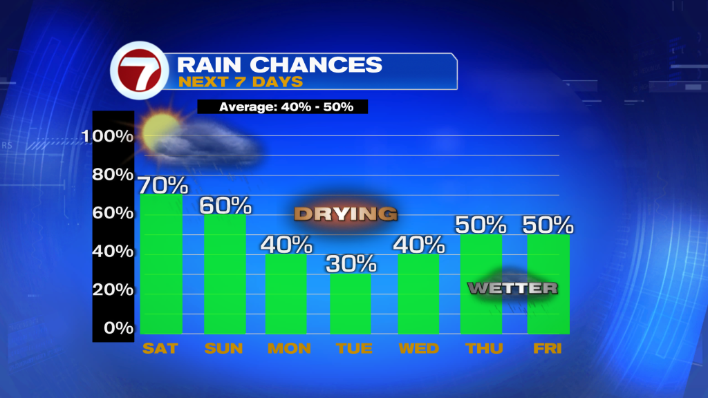 Some relatively drier air will finally arrive early next week, which will drop our rain chances and will allow for temperatures to be a degree or two warmer with more sunshine around. Enjoy this drier time while it lasts because more rain and thunderstorms is expected to arrive by the end of next week.