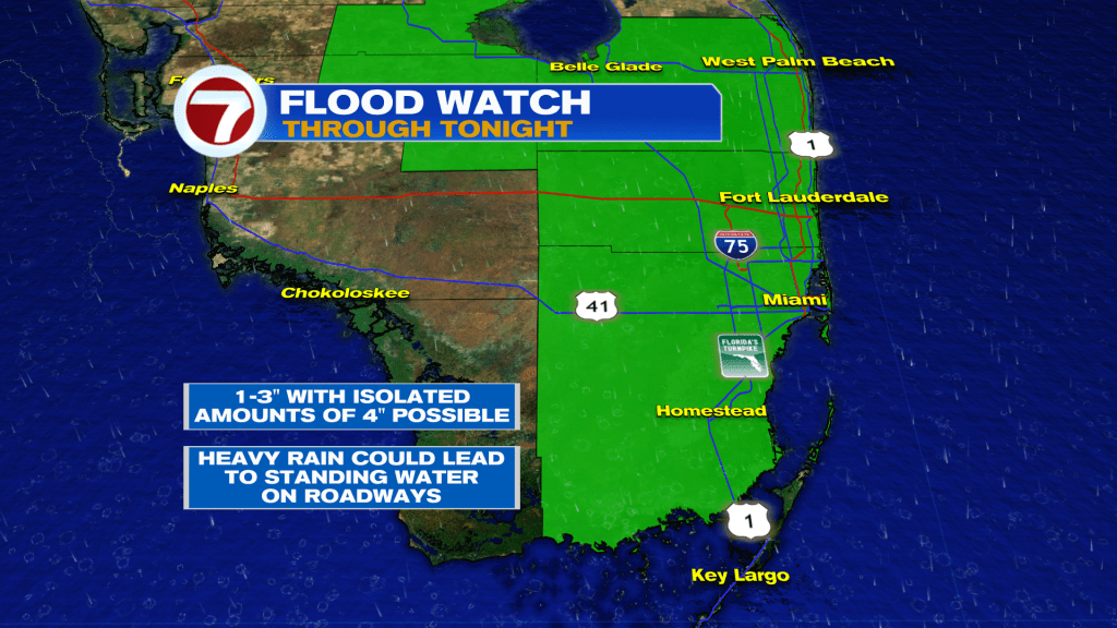 Given the repeated rounds of heavy rainfall in spots, a Flood Watch remains in effect through tonight across Miami-Dade and Broward Counties.