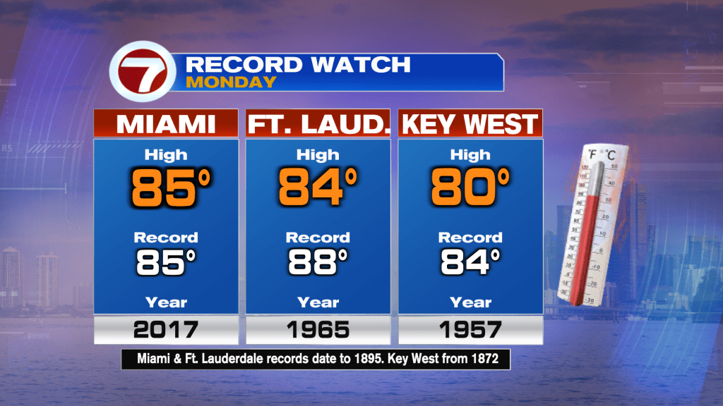 Monday will also be a warm day overall with the potential for record heat in Miami.