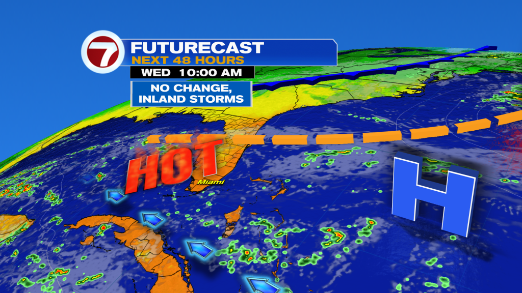 High pressure is holding and filtering in drier air. However, this will change late week with more moisture around for rain. By Thursday, typical chances (50%) returns, so scattered storms possible.