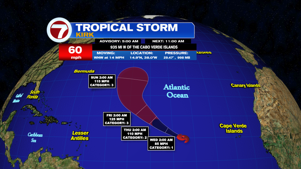 Tropical Storm Kirk forecast to become a large and powerful hurricane in the middle of the Atlantic late week.