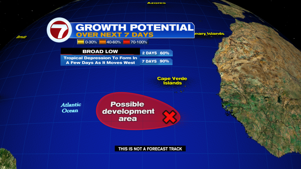 Showers and storms continue to show signs organization with a broad area of low pressure located a few hundred miles S/SW Cape Verde Islands. A depression could form in few days over the Eastern Tropical Atlantic.