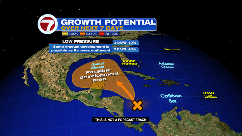 Disturbance in the Caribbean could gradually get organized late week or this weekend as it travels through the NW Caribbean and into the Gulf of Mexico. NHC still giving it a medium chance to form during the next 7 days.