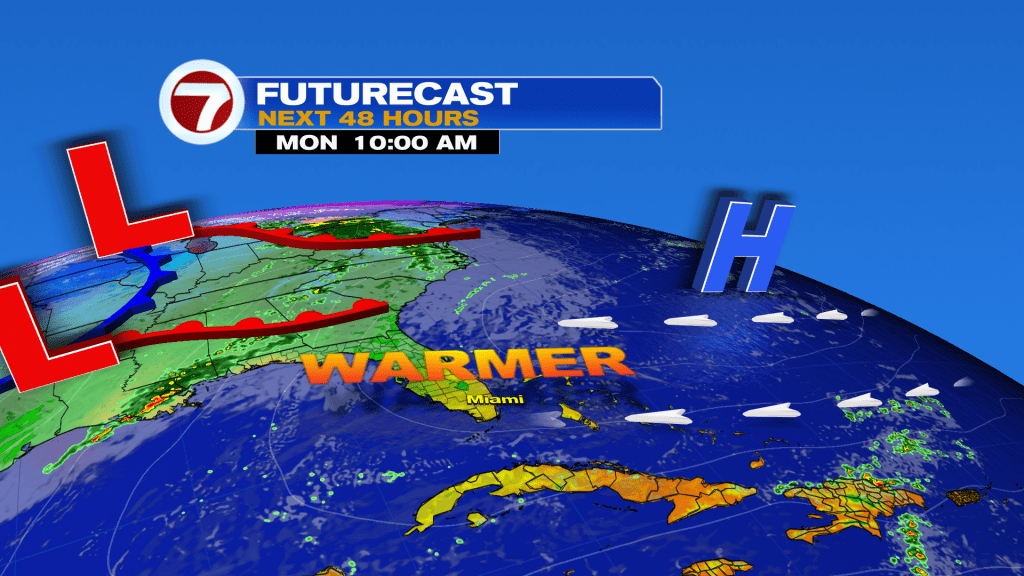 High pressure moving into the Western Atlantic Ocean is providing for winds today out of the East-Southeast and that will help temperatures moderate to near average values. This means lows will be in the upper 60’s and highs near 80 degrees through Tuesday with dry air in place.