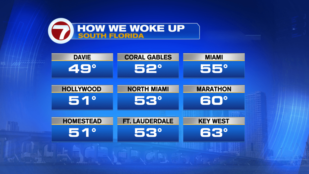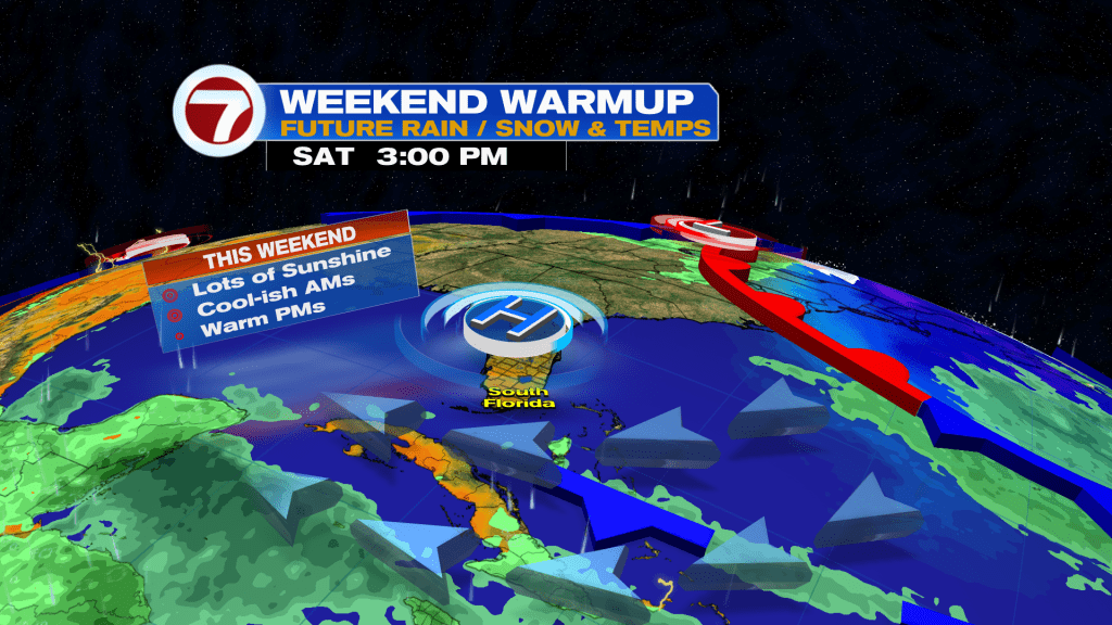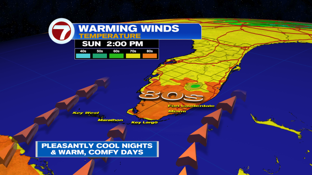 That will be followed by very pleasant high temperatures topping off into upper 70s all across South Florida. Thursday’s weather conditions will feature partly cloudy to partly sunny skies along with a beach breeze.