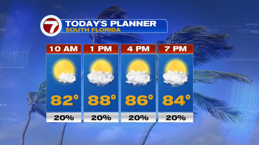 Today in South Florida will be a lot like what we saw yesterday. Other than a brief spotty or isolated shower, rain chances across our area will remain on the lower end. But as the wind continues to veer off the water, one difference you will notice is a few more clouds than what we saw on Wednesday. Afternoon high temperatures will once again be near-average in the mid to upper 80s while our coastal locations continue to enjoy a nice beach breeze. And because that beach breeze will continue to increase in speed, the risk of rip currents will remain high across area beaches while King Tides continue to cause minor saltwater flooding, especially during times of high tide. This is forecast to continue through the weekend.