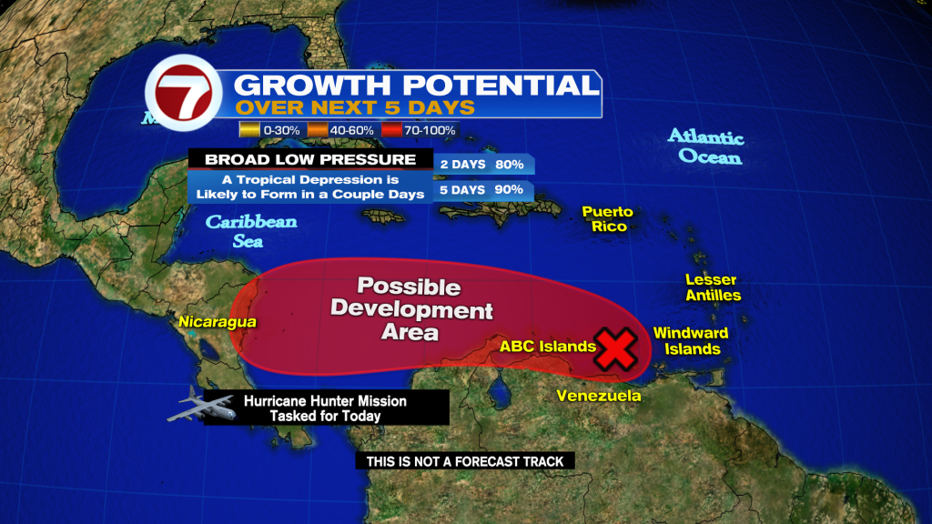 As conditions across South Florida remain quiet, the Tropics still remain active as we still have 2 months left of hurricane season. Tropical Depression 12 remains a few hundred miles WNW of the Cape Verde Islands and is struggling to stay alive as it battles strong upper level winds. This system is forecast to fall apart by the end of the week as high pressure steers it to the WNW. Closer to home, we have a broad area of low pressure that has moved into the Caribbean and continues to produce heavy rain and gusty winds across the Southern Windward Islands, the northern coast of Venezuela & the ABC Islands. A tropical depression is likely to form in the next day or so as it moves into the Central Caribbean and is forecast to be a heavy rain maker for Central America.