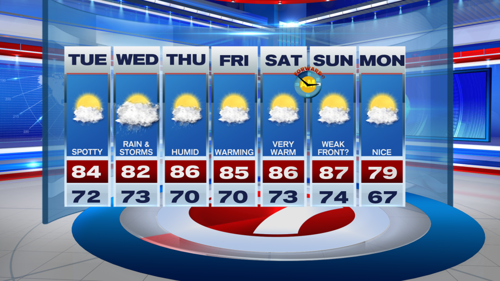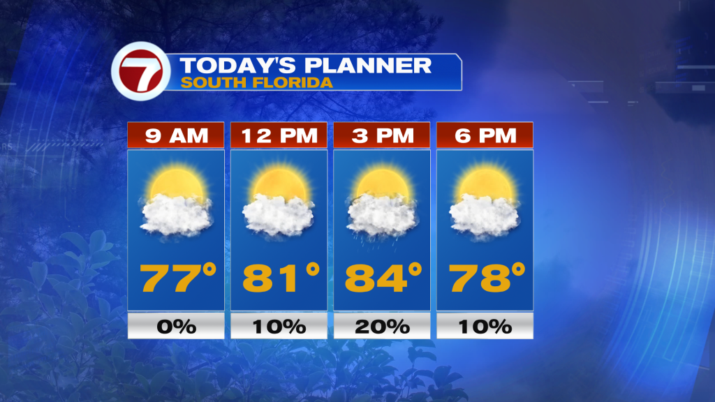 Today will be a lot like what we experienced on Monday with the development of a seabreeze determining our weather. The only change will be fewer showers & thunderstorms. High-pressure will remain nearby and bring an onshore wind once again. And with temperatures once again, reaching into the 80s this afternoon, showers and maybe a spotty storm could develop along the seabreeze. Any showers develop will be mainly inland while a few could leak into our western suburbs of Miami-Dade and Broward. Overall, rain chances today should be on the rather low end.
