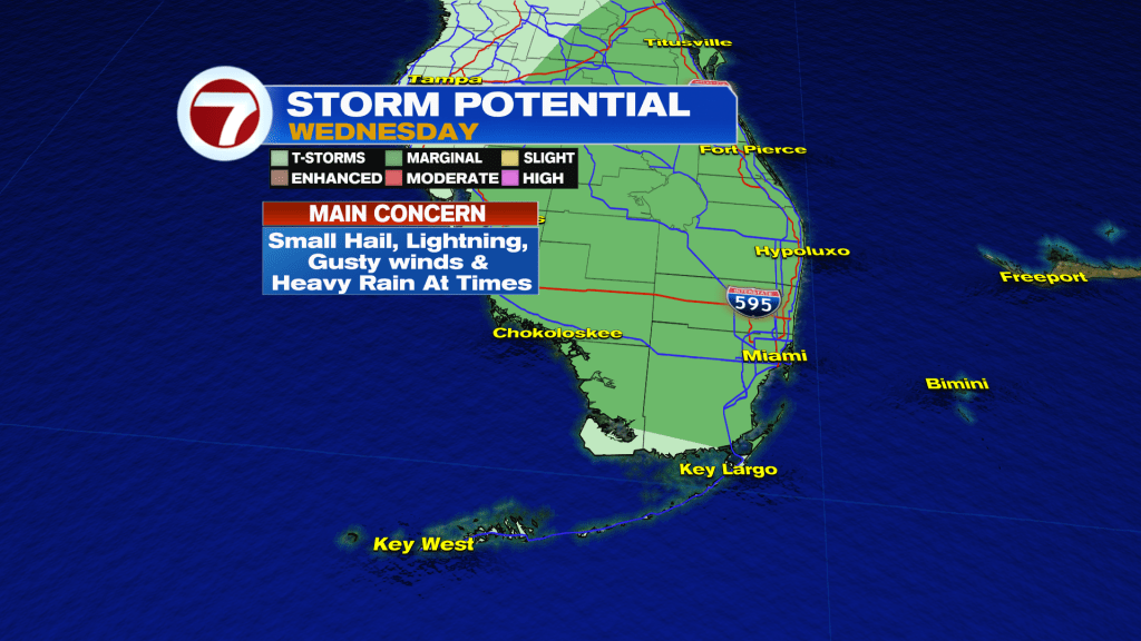 The mainly quiet weather will finally come to an end as an area of low pressure in the Northern Gulf of Mexico pushes across Florida on Wednesday. Clouds will build and moisture will be on the rise as the above-mentioned disturbance crosses our state. Thunderstorms will return to the forecast and some of those storms could be on the stronger side. So South Florida has been placed under an elevated risk for isolated severe thunderstorms Wednesday until that disturbance moves away. The main threats with any storm that develops will be gusty winds, small hail, heavy rain at times and lightning.