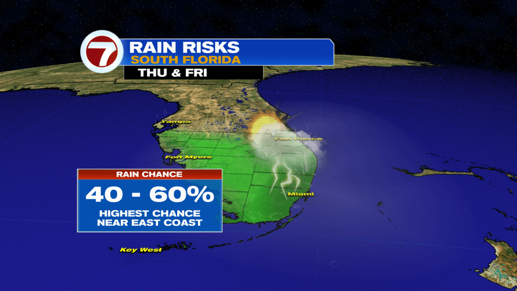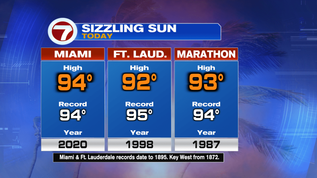 Following the hottest day of the year (tied with June 16) of 95F in Miami, more hot weather is ahead this Wednesday. Miami is forecast to reach 94F, which would tie the record set back in 2020. Marathon will also come close to its record with a forecast high of 93F.