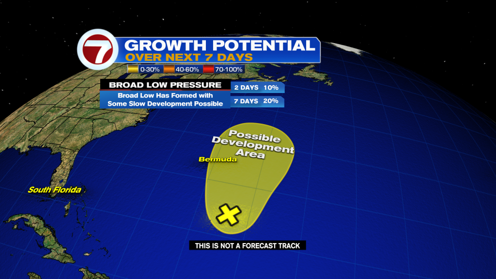 In the tropics, the remnants of then-Tropical Storm Cindy no longer are expected to develop but there is a new area the National Hurricane Center is watching. As of 8AM, a broad area of low pressure south of Bermuda has a 20% chance of developing over the next week as it tracks to the north over the Atlantic Ocean.