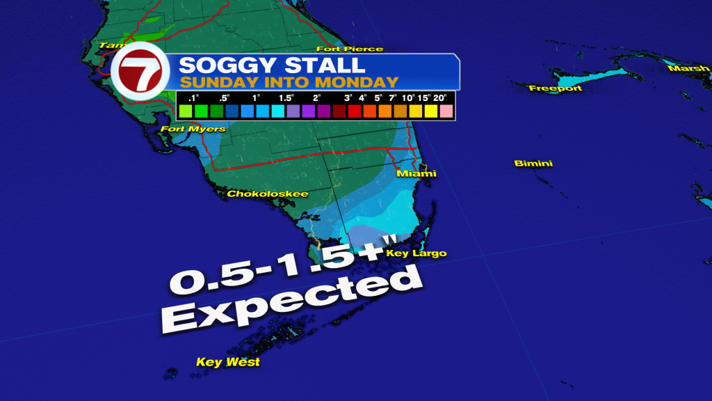 The best chance for rain with this front will be Sunday night into Monday as the front presses through while stalling near South Florida or just offshore to our east. The rain will continue at times into Monday morning — and perhaps the early afternoon hours — until drier air begins to flow in by Monday night. Given the clouds, showers and northerly wind flow on Monday, temperatures will be cooler and below average into the mid to upper 70s for highs.