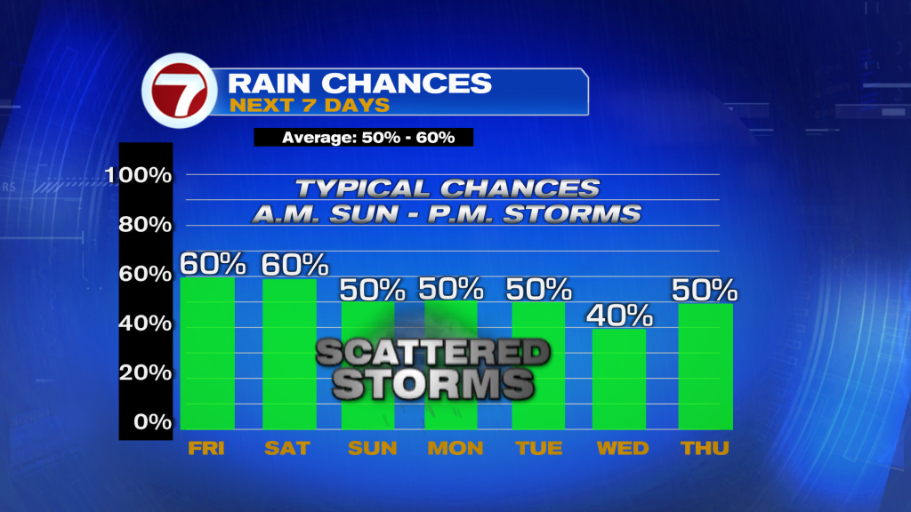 Early next week, temperatures climb back into the mid 90’s in the afternoon and nearing heat advisory criteria. Typical rain chances between a 50-60% will remain in the forecast through much of the week.