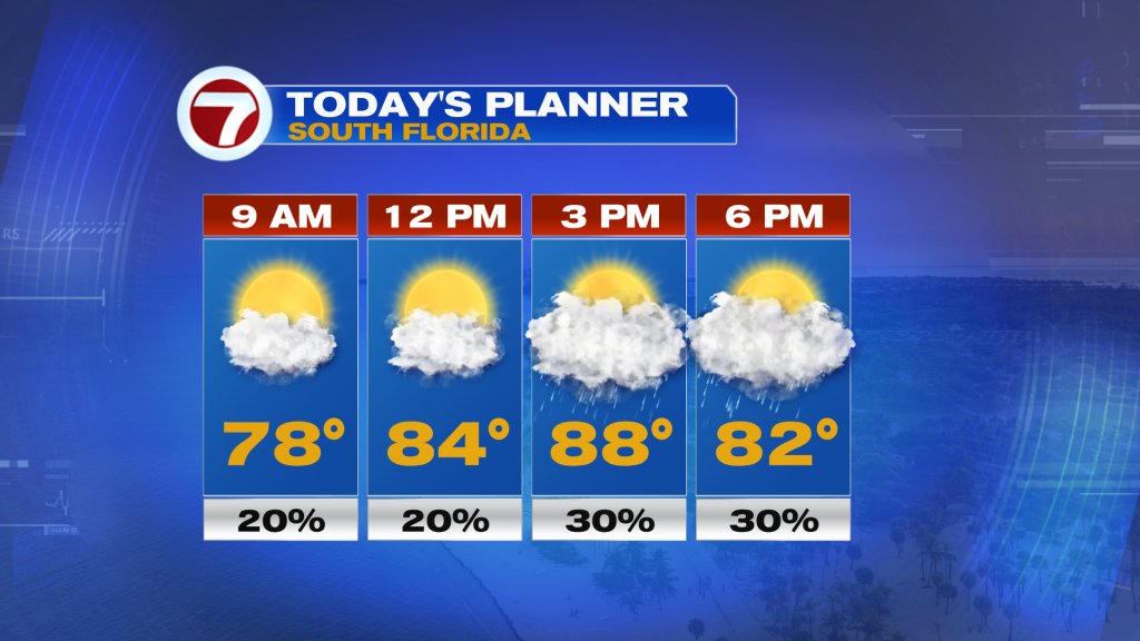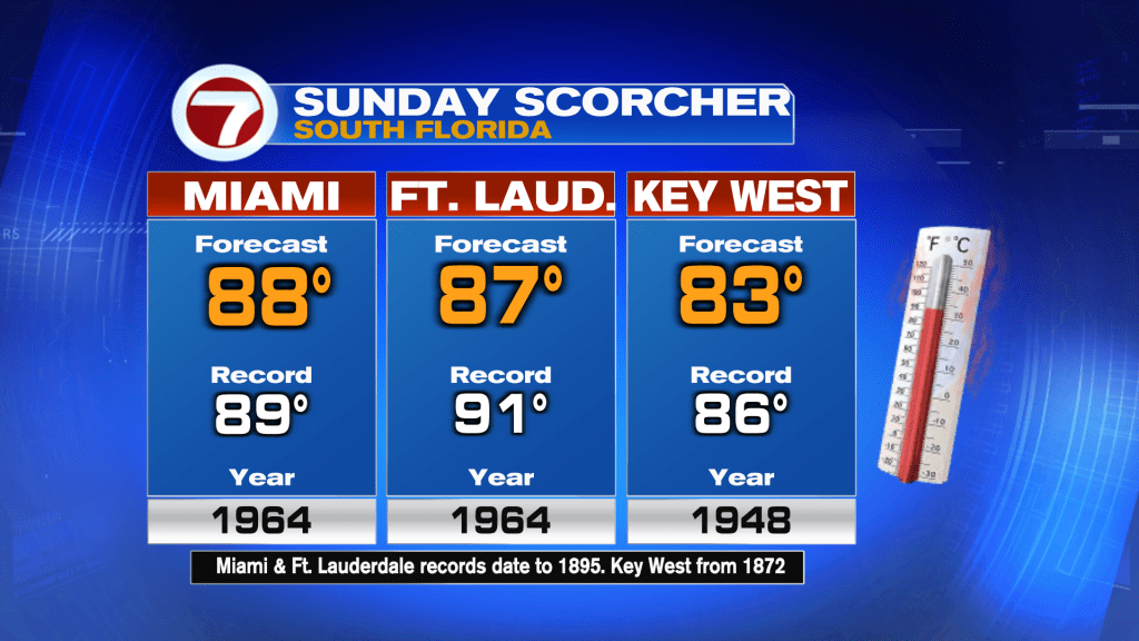 Widespread highs in the upper 80s are forecast this afternoon across mainland South Florida, which will come close to the record, especially in Miami.