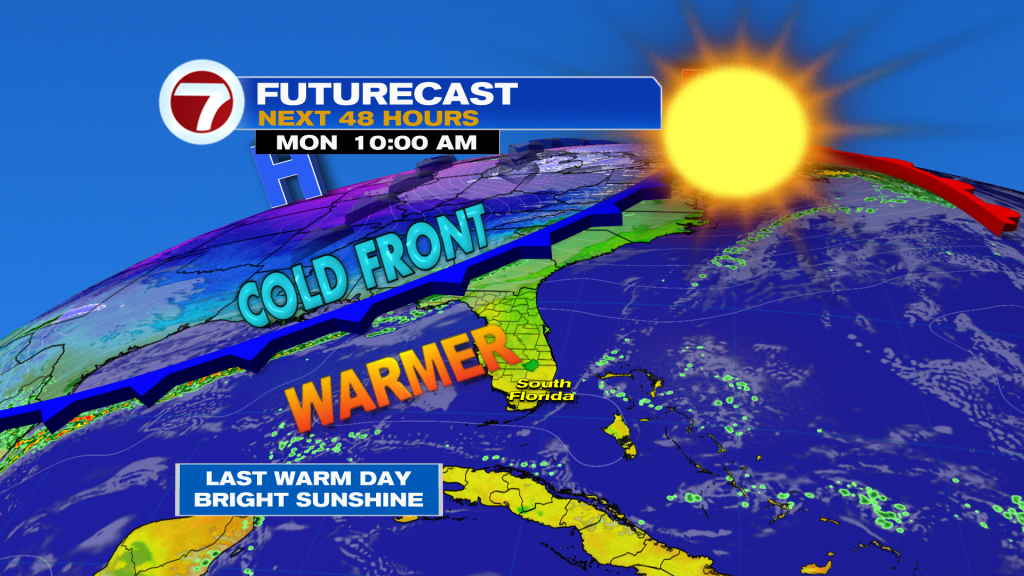 After today’s temperatures in the 80s, South Florida will enter a cooler weather pattern for the final days of 2025. A strong front is forecast to sweep across South Florida by Tuesday. Behind it, northerly winds will tap into cold Canadian air and bring an Arctic Blast in our direction. This means Tuesday afternoon temperatures will already be a bit more comfortable in the mid to low 70s as the cold and dry air continue to spread across the area.