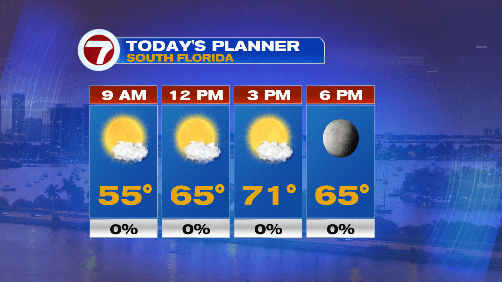 Thankfully for our Wednesday, we’ll continue to see sunshine and just some patchy clouds, especially by the coast. Afternoon temperatures will be much milder into the low 70s today with the exception of the Florida Keys, which will remain stuck in the mid 60s.