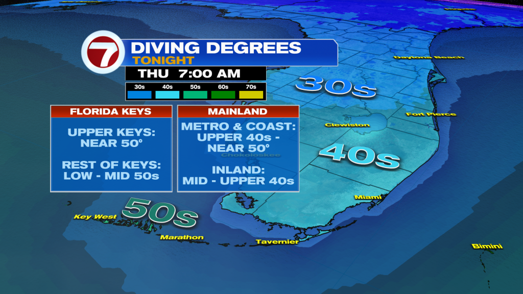 Wednesday morning has been even colder with widespread lows in the 40s across Broward County, near 50F across Miami-Dade County and in the 50s across the Florida Keys.