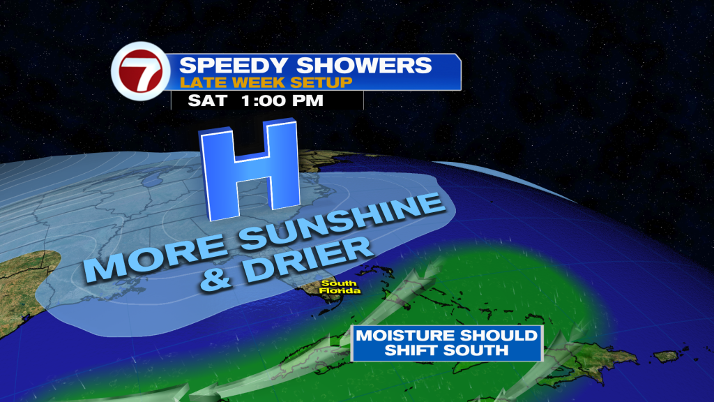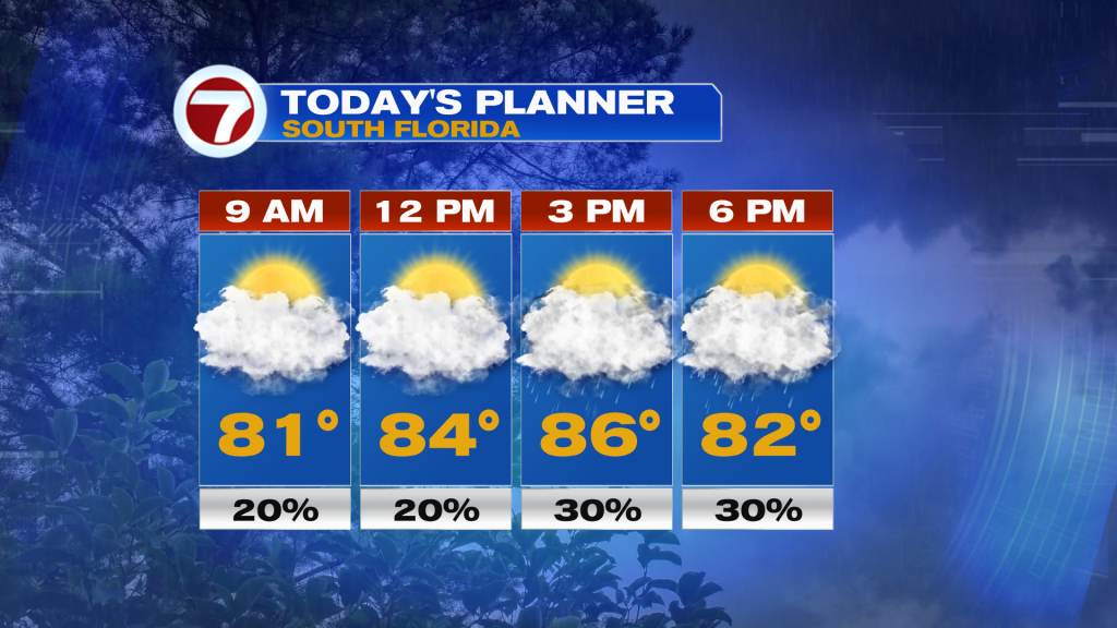 This Thursday, expect clouds to dominate much of the day with quick-moving showers in spots, especially Miami-Dade and the Florida Keys. This will hold highs close to normal into the mid 80s.