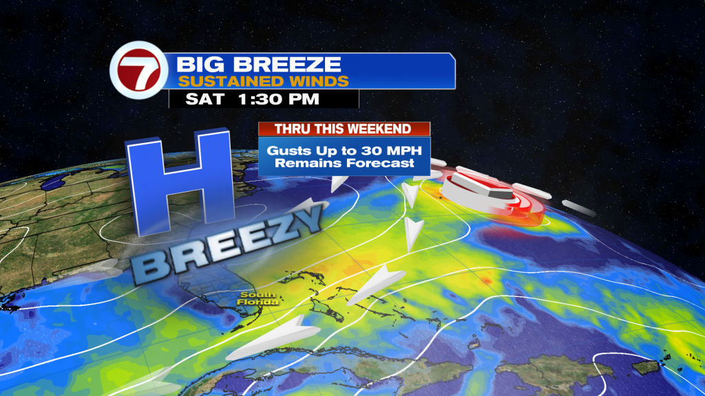 Beyond then, it will turn warmer and more humid with a brief break from the breeze early next week. This period will come with the chance for a few showers and storms but it will remain fairly quiet overall.