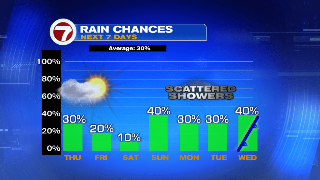 As high pressure shifts farther south over the next day or two, that should also nudge the moisture that has been in place for these showers also more to the south, meaning more sunshine and drier conditions are expected by Saturday. With more sunshine in place, temperatures should be a touch warmer into the mid to upper 80s.