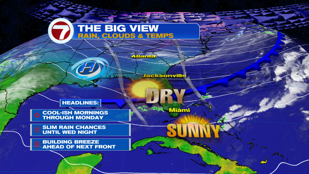 Expect plenty of sunshine and dry conditions this Sunday with highs not too far from average, reaching the low 80s across Miami-Dade and Broward and the mid to upper 70s across the Florida Keys.