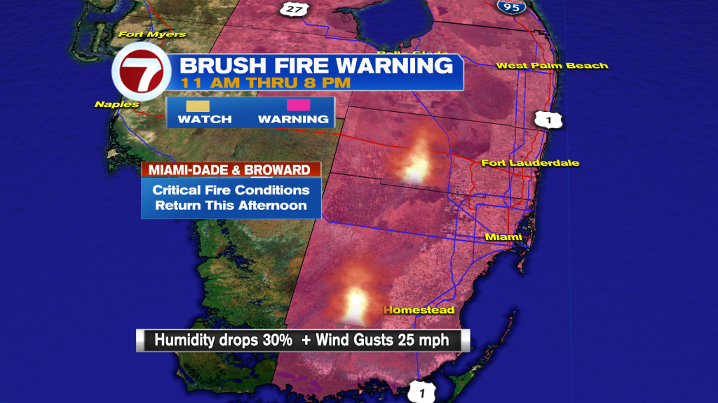 A Brush Fire Warning has been issued for Miami-Dade & Broward Counties from 11am to 8pm as critical fire conditions return to South Florida. South Florida will be dry once again today, humidity levels remain low and winds will be increasing in speed later this afternoon. All of this, together with ongoing drought conditions, will increase fire threat across the area and cause any fire to spread quickly.