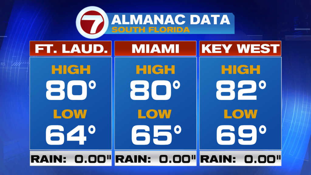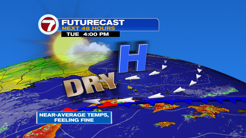 Looking ahead, South Florida will undergo a warming trend as the dominant weather features begin to shift. The area of high-pressure that will keep very nice and quiet conditions through the first half of the week will begin to shift farther east into the Atlantic by the end of the week and into the upcoming weekend. As it does so, this will cause our wind pattern to veer off the water. That means onshore winds will bring milder overnight temperatures, warmer temperatures during the afternoon and a few clouds passing through from time to time. As we work our way into the weekend, South Florida will not only notice warmer temperatures, but also humidity levels on the rise. As our wind pattern veers out of the south, our afternoon high temperatures will once again reach the upper 80s as humidity levels become less comfortable. The good news is that South Florida should remain mainly dry for the foreseeable future, apart from a spotty shower coming off the breeze.
