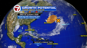 A large area of clouds and rain is sitting several hundred miles East of Bermuda. NHC thinks that as it moves west into the area highlighted orange, it could organize into a Non-Tropical Low pressure system. This means it may look like a regular storm, but instead of a warm center, it will have a cold one. The chances for this happening stand at 30% over the next two days and 60% over five days. If it develops, it will be called “Ana”. Eventually, it will move away into the cold waters of the Northern Atlantic. We’ll keep you posted.