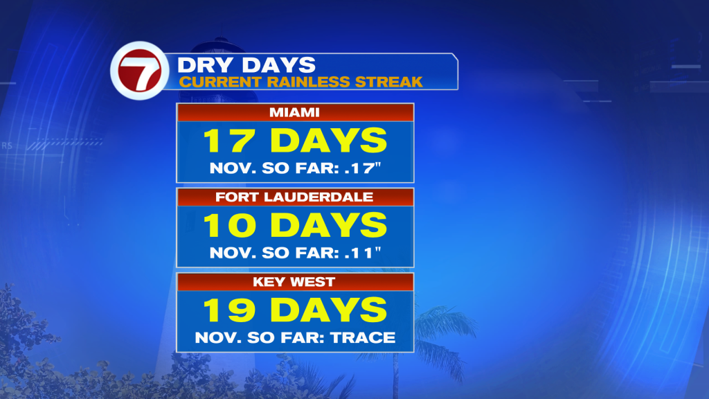 Therefore, no rain is in the forecast, and we could use it as it’s been a dry November with an ongoing 17-day dry streak for Miami, as of Wednesday.