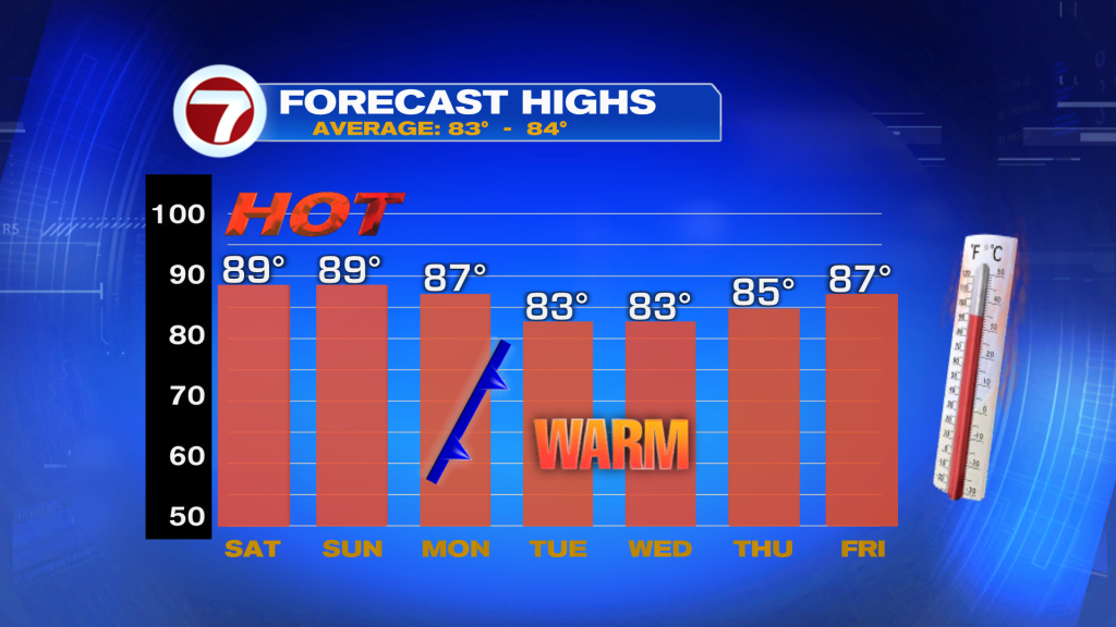 Unfortunately, rain does return to the picture on Sunday. The day should begin on a mostly dry and bright now but afternoon showers and thunderstorms are expected to develop inland and push toward the east coast metro during the later half of the day. Rain chances will be higher at a 50% chance and some heavy rain will be possible.