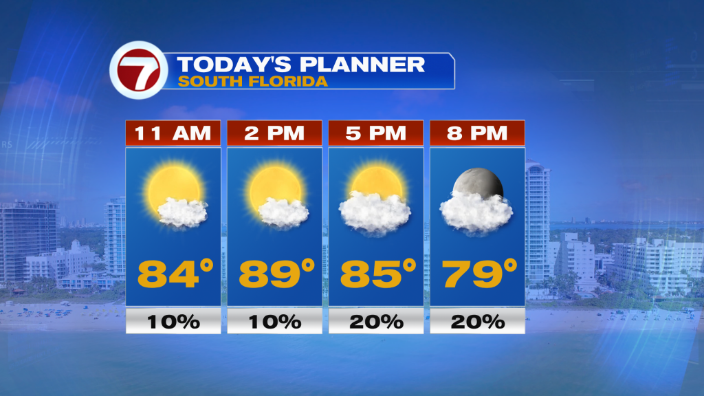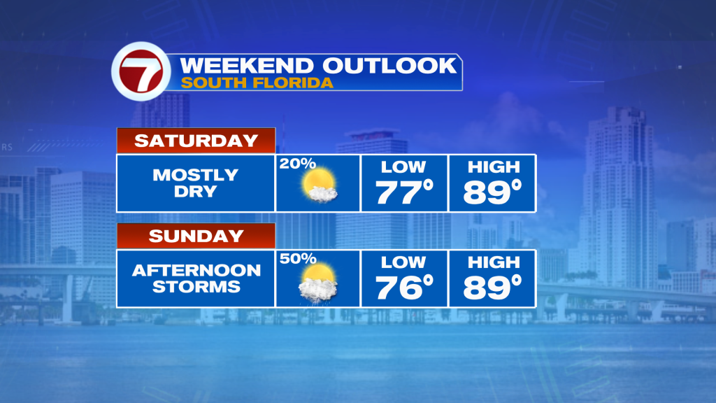 Following a historic amount of rainfall in parts of Broward County earlier this week and days and days of heavy rain, we will finally and thankfully see a break from the rain this Saturday. Rain chances will be low at a 20% chance with only a stray afternoon and evening shower or storm possible. A southeast wind that will be dominant today should protect us from the rain, keeping most — if not all — of the afternoon rain activity over rural sections of South Florida. Instead, the day will feature sunny to partly cloudy skies with hot conditions. Highs will be about 5F above average into the upper 80s at many locations. Even a couple areas could top off at 90F.