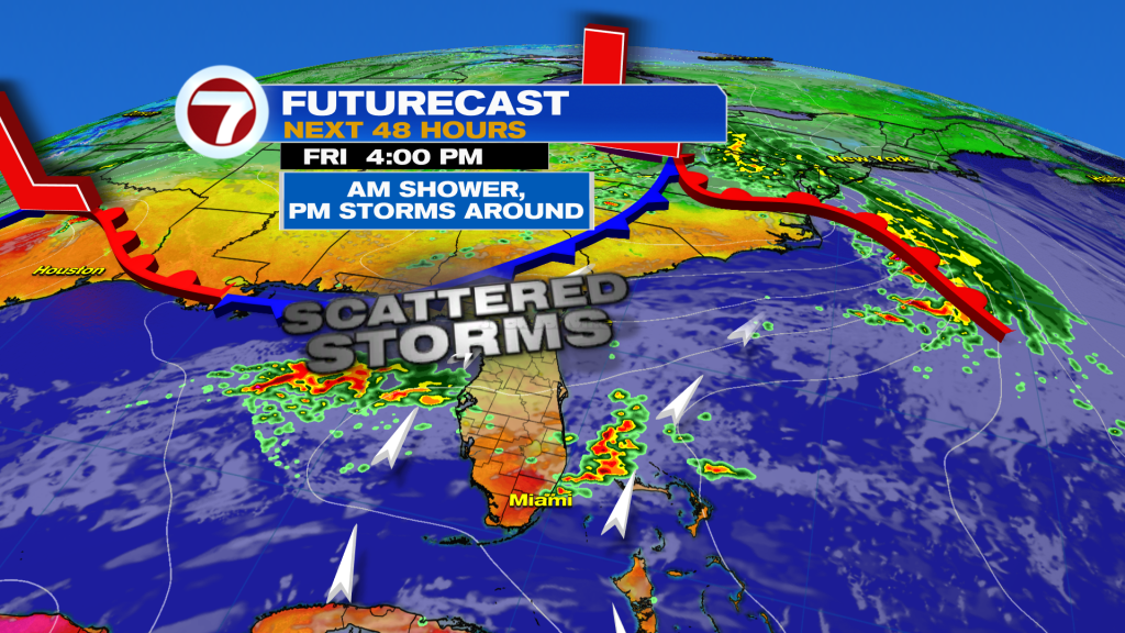 Looking ahead, South Florida prepares to enter a stormy weather pattern once again. But the upcoming weekend doesn’t look like a complete washout. While afternoon thunderstorms return to the forecast both Saturday and Sunday, they will be mostly confined to the afternoon hours on Saturday (and not everyone will see rain). And while this will also be true of Sunday afternoon, a few showers may still be possible earlier in the day as a weak front moves closer to South Florida. This front will reach our area early Monday but no cooldown is expected. What we will see, however, is slightly lower humidity across South Florida on Tuesday. Unfortunately, during this time, afternoon high temperatures will remain in the upper 80s and low 90s.